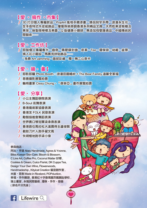 一齊參加【Lifewire愛搞作‧慈善情人墟】,將愛意雙倍奉上。向摯愛、至親,及社會上有需要的人士,獻出更多祝福及關愛。
