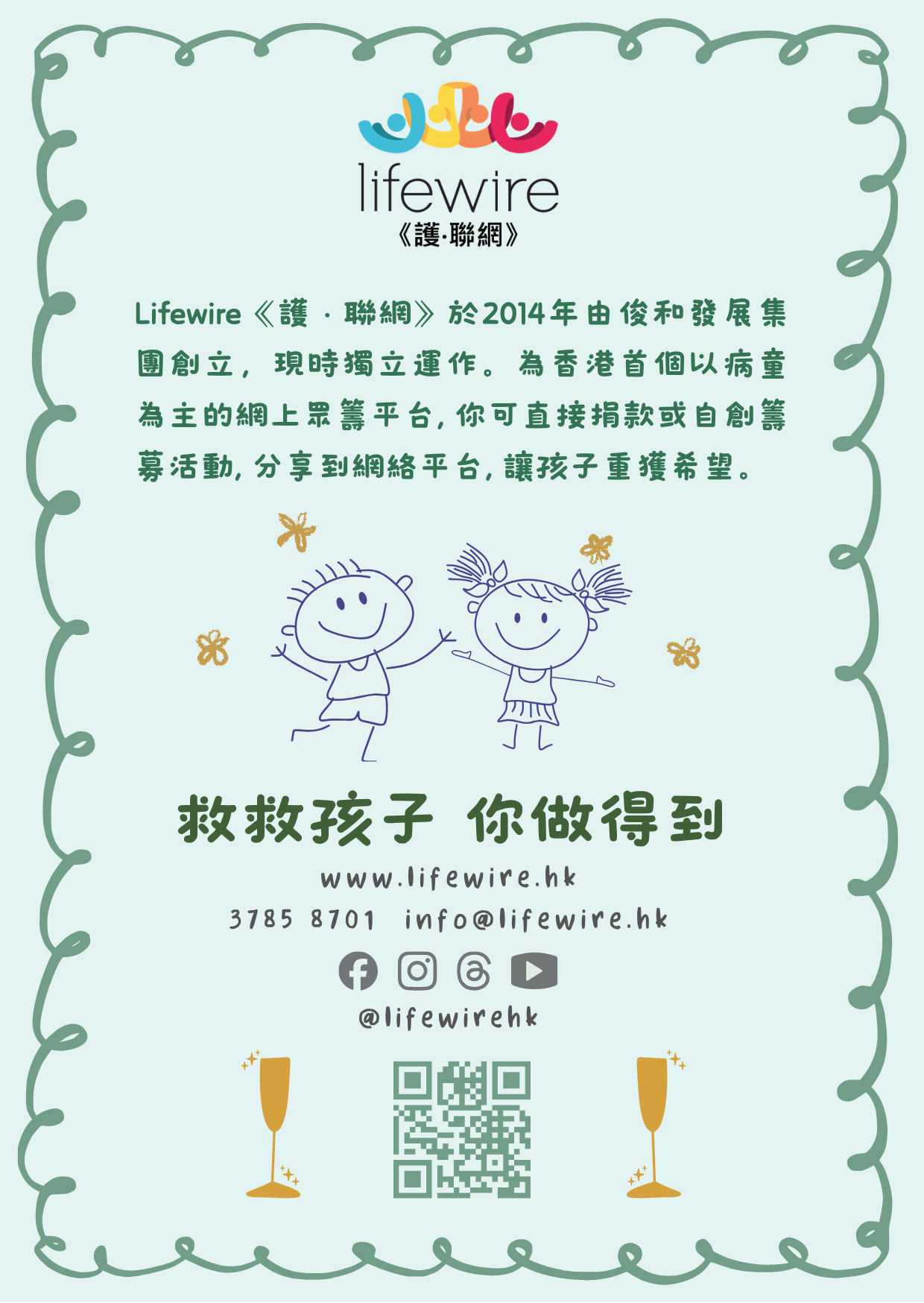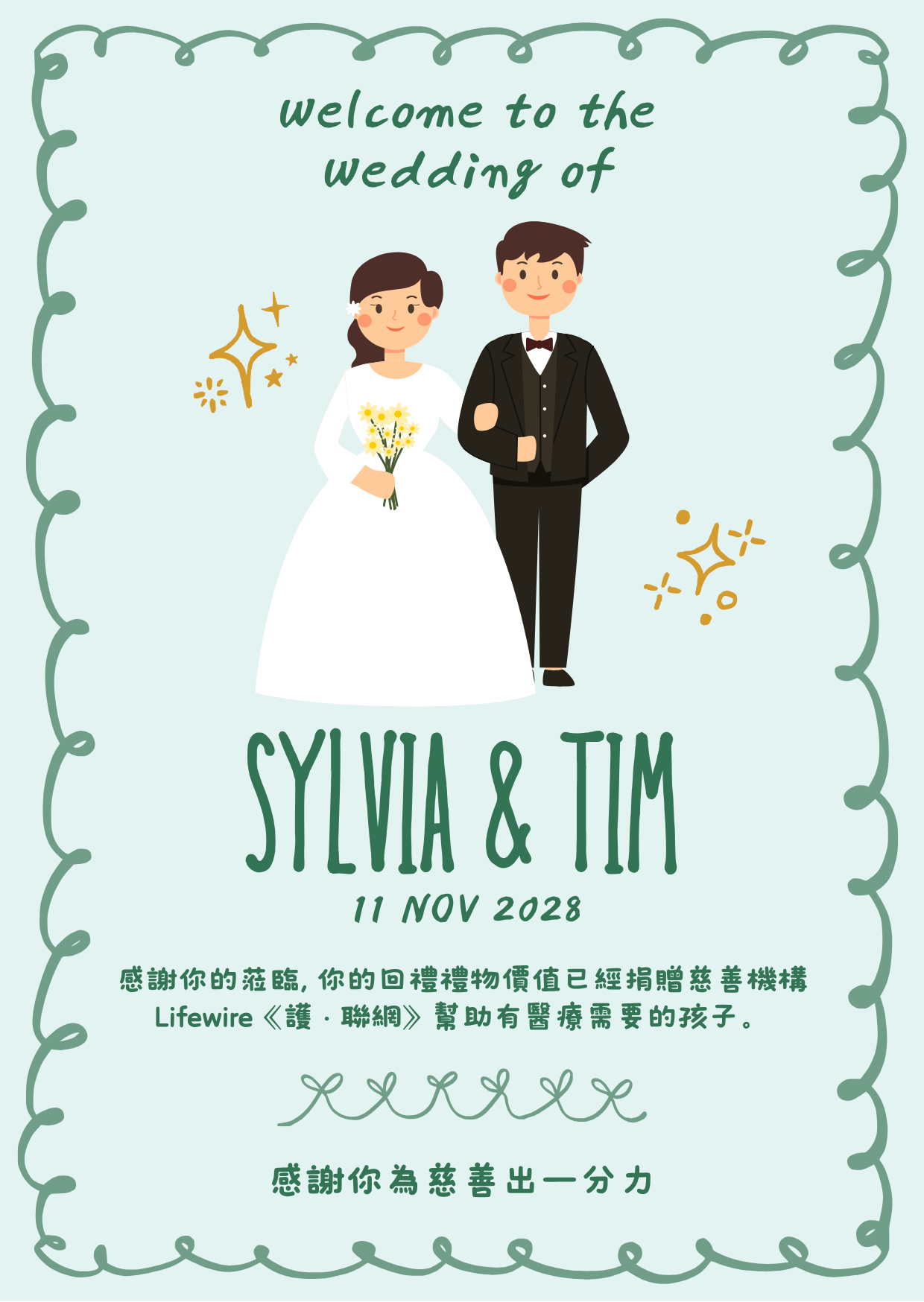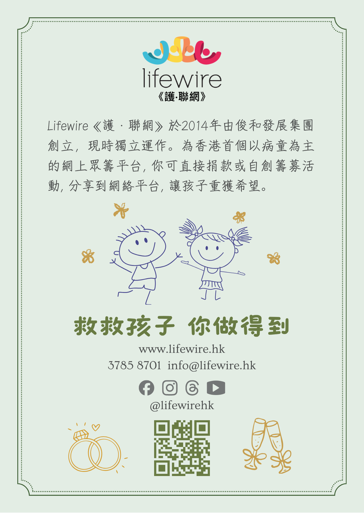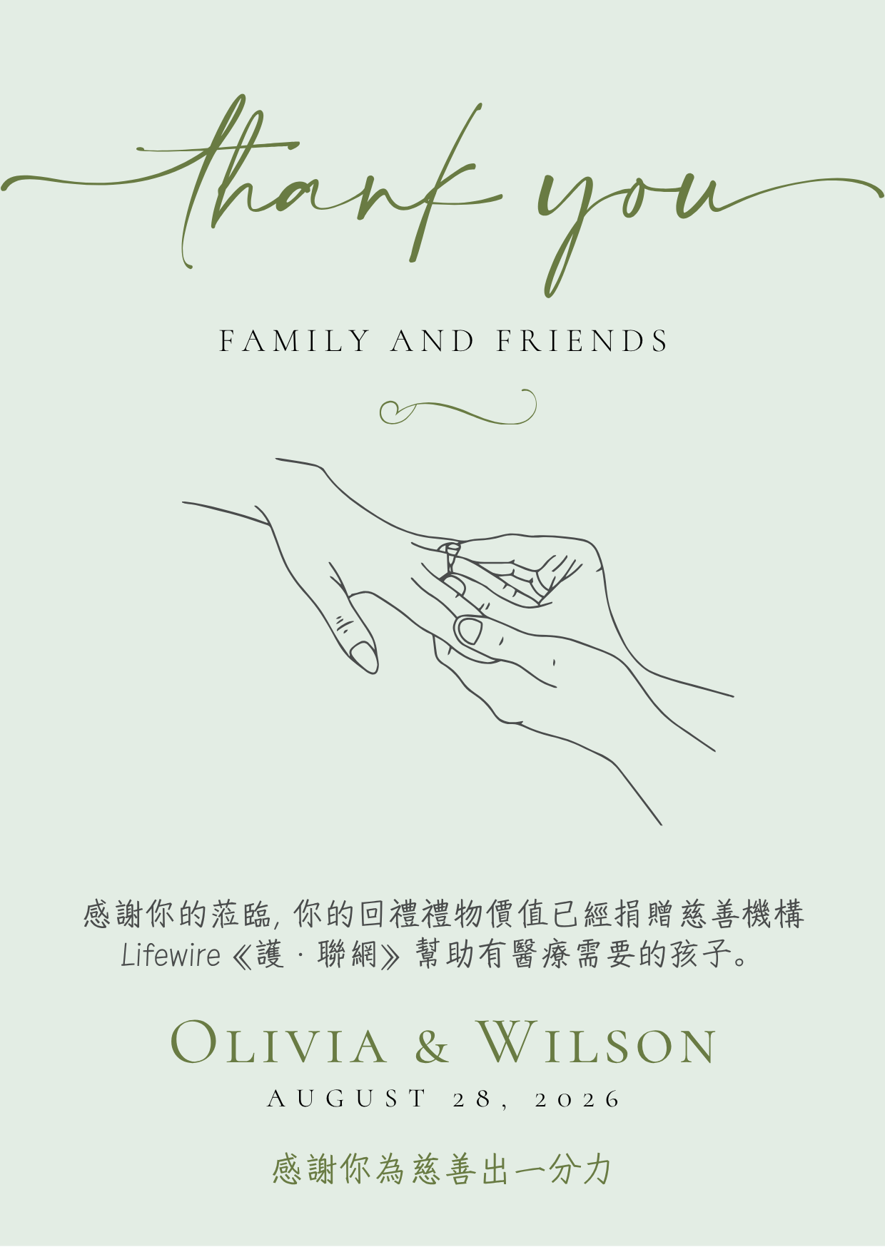 將婚宴回禮小禮物或賓客賀禮化作愛心捐款,幫助Lifewire罕見病個案,給予病童延續生命的機會。以回禮心意卡贈送賓客,讓他們一同分享助人的喜悅。歡迎支持《護‧聯網》的婚宴回禮計劃,將心意捐贈病童作醫療用途。響應慈善捐贈,分享‧愛! 婚宴回禮捐款套餐A)$1,888 –電子版祝福小卡 (Ecard) + 實體祝福小卡 (200張以下) + 新人愛心證書 + Lifewire季刊 (200份以下) B)$2,888 – 電子版祝福小卡 (Ecard) + 實體祝福小卡 (300張以下) + 新人愛心證書 + Lifewire季刊 (300份以下) + 新人專屬E Invitation Video + 新人專屬簽名布 C)$3,888 – 電子版祝福小卡 (Ecard) + 實體祝福小卡 (500張以下) + 新人愛心證書 + 新人專屬E Invitation Video +Lifewire季刊 (500份以下) + 新人專屬簽名布 + 厚麻布拉鍊環保袋2個 (罕病童林卓瑤手繪,鄭秀文加持)