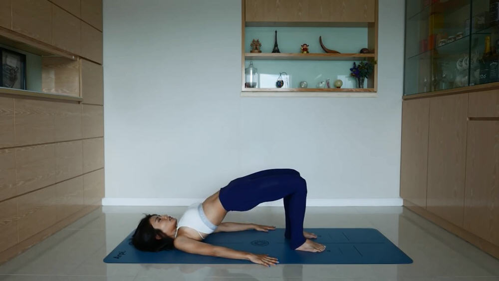 躺在瑜伽蓆上,雙腳屈曲,腳掌對腳掌並打開膝蓋,雙手按地,將臀部升起20次。 動作四:減臀部
