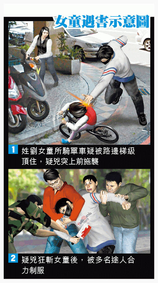 台北昨发生骇人听闻的随机杀童案!一名4岁女童昨日与母亲外出时,在路口被一名陌生男人手持斩骨刀当街斩杀,兇徒连续向女童颈部狂斩12刀,最终女童身首异处,当场惨死!目击女儿遇害的妈妈事后强忍眼泪说:「虽然(我们)没有手牵着手,但只有隔着1公尺(米)的距离而已。」疑兇曾接受精神病治疗及有吸毒前科,未知是否病发或吸毒后行兇。 昨日上午11时许,居住在内湖区、乳名「小灯泡」的姓刘女童与母亲一同外出,前往西湖捷运站迎接祖父、祖母及双胞胎弟妹回家。小灯泡当时骑单车,妈妈则推着婴儿车。当她们走到环山路准备过马路时,一名尾随男子突然从后袭击女童,用刀狂斩其颈部,女童遇袭倒地后被压在地上,结果头颅被斩断,身首异处。